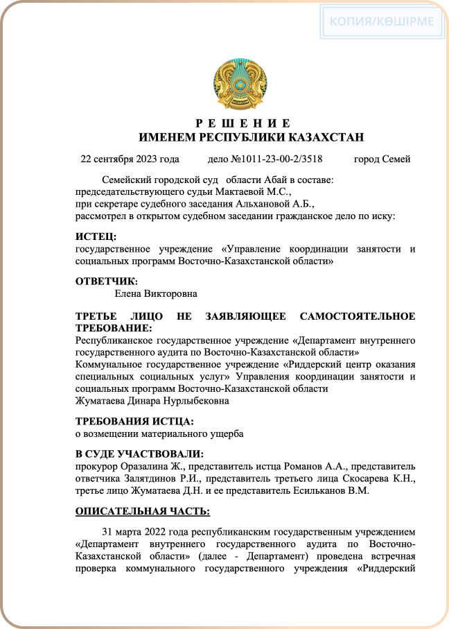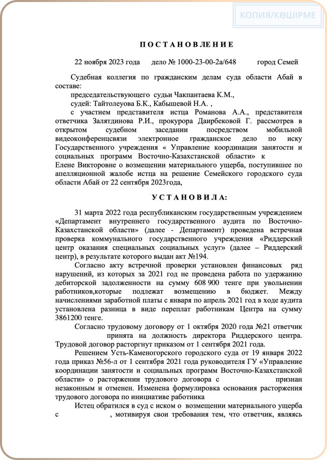 Управление координации занятости и социальных программ ВКО обратилось в суд о взыскании материального ущерба к бывшему директору подведомственной организации. Мы защищали права и законные интересы директора Е.В.