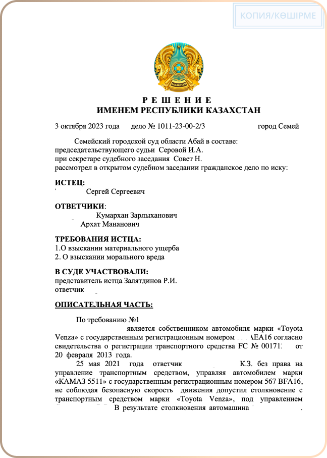 Водитель Камаза, грубо нарушив Правила дорожного движения допустил дорожно-транспортное происшествие повредив автомобиль «Toyota Venza», чем причинил крупный ущерб собственнику, интересы которого мы защищали.