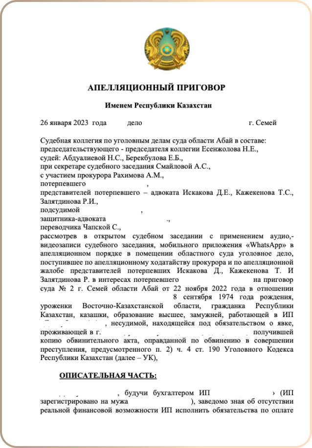 РЕЗУЛЬТАТ: виновному лицу назначили 6 лет лишения свободы, с нее взыскали 18 108 538 тенге (в том числе сумму гонорара, оплаченную Адвокатской Конторе).