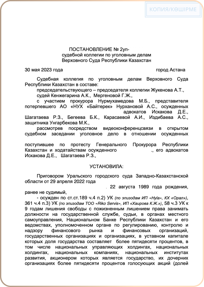 Судебная коллегия по уголовным делам Верховного Суда Республики Казахстан осудила правонарушителя.