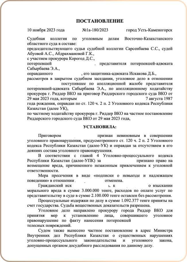 Добрый день. Спасибо вам за отзыв, очень приятно читать теплые слова о нашей работе! С уважением, управляющий партнер Адвокатской Конторы «Defenders», адвокат Искаков Даурен Ергазыевич.